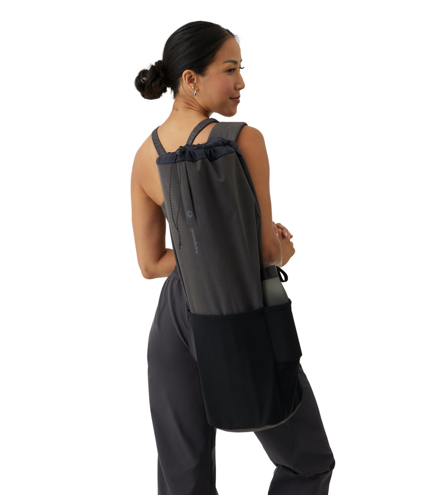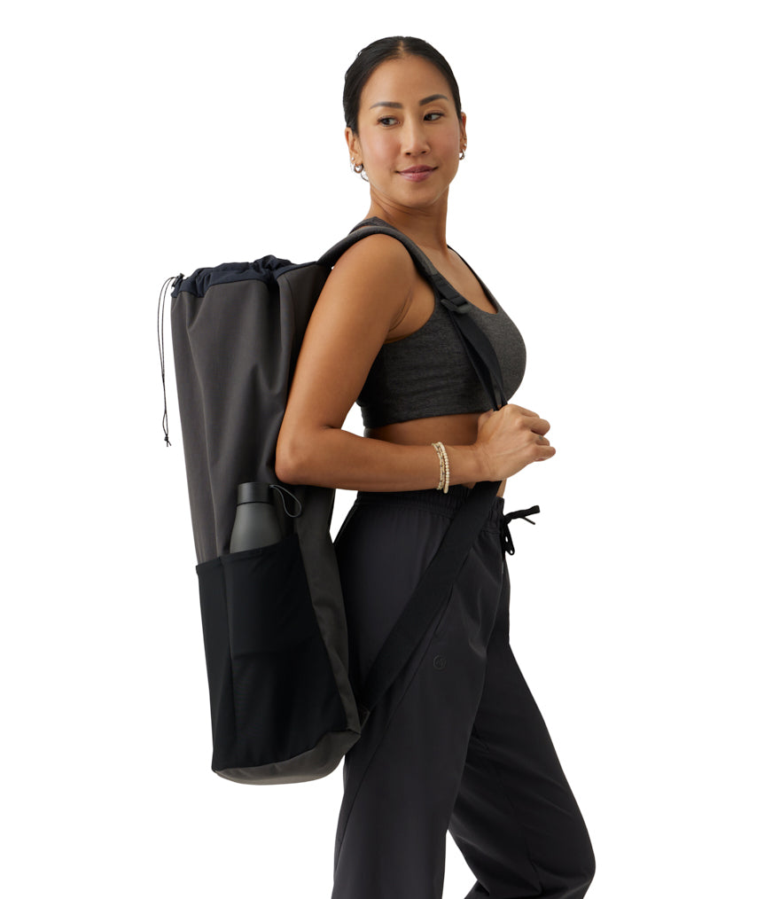 The Hala Mat Carrier is the universal solution for carrying your mat anywhere. Its one-size design fits most mats*, while an adjustable bungee cinch keeps your mat secure. A wide shoulder strap provides comfort on the go, and durable recycled nylon construction stands up to daily use. With added details like a front grab handle and exterior mesh pocket, the Hala makes transporting your practice effortless.